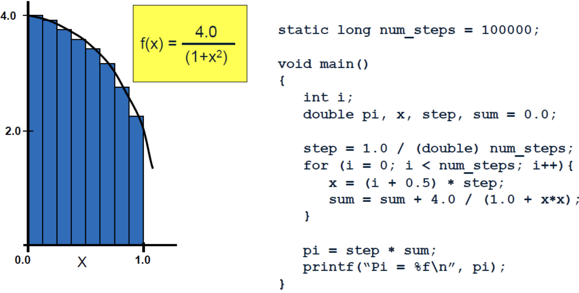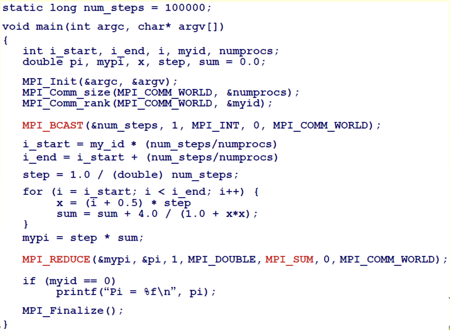 파란 사각형들의 면적을 구하는 경우 reduction을 수행하면 된다. 프로세서끼리 구역을 나눠서 처리한 다음 MPI로 통신하여 하나의 결과를 내는 것이다.
