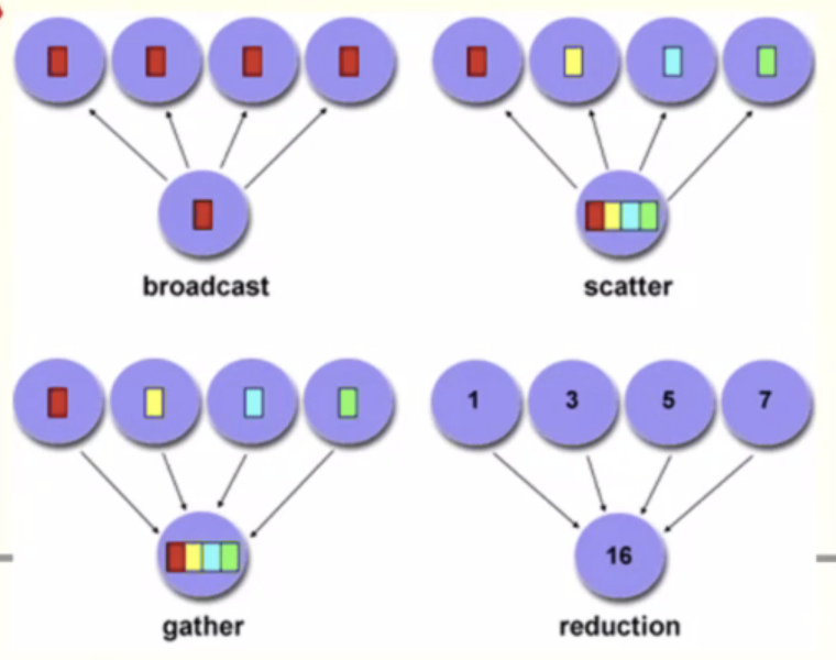 *reduction : 작은 semi 결과들에 대해 add, or, and, min, max등을 통해 최종 결과를 만드는 것. 모든 프로세서의 data를 모아서 한 결과를 반환하는 것