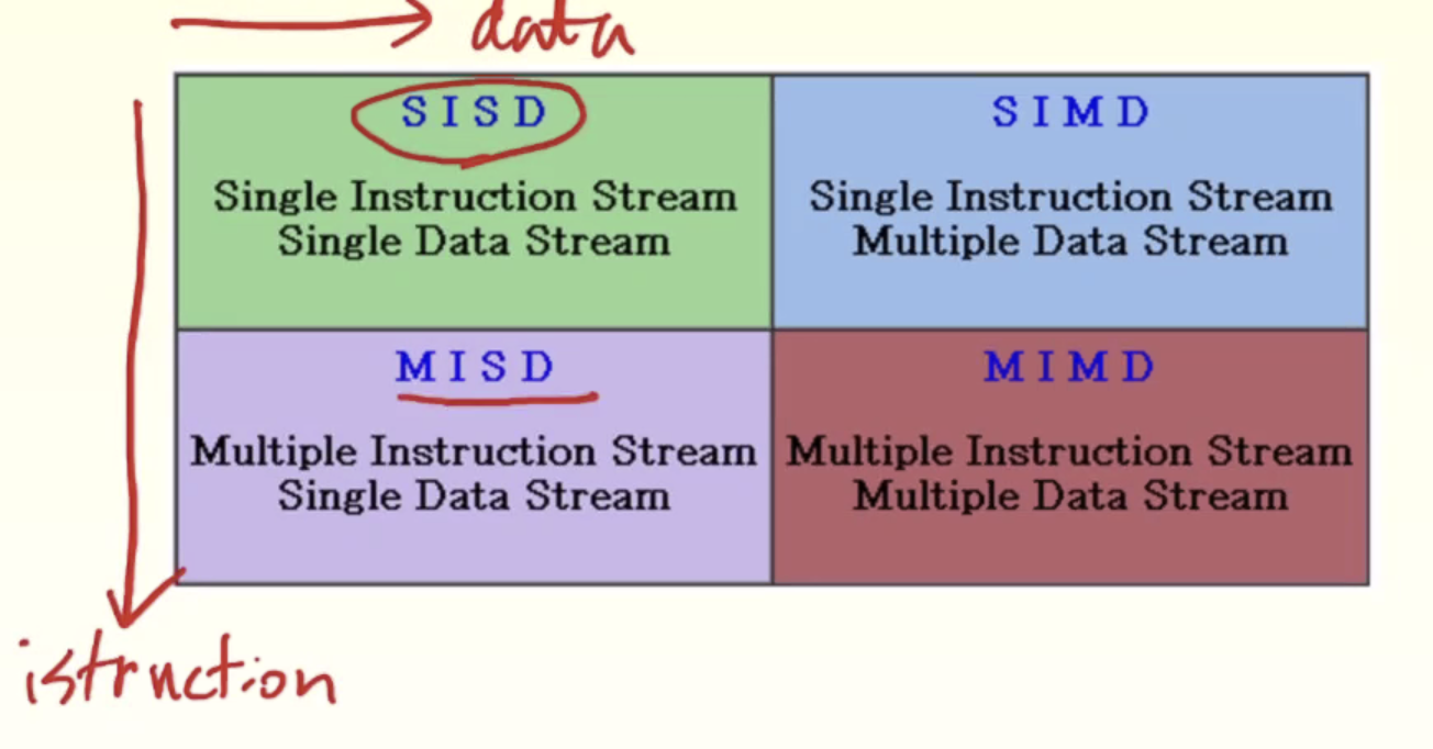 Instruction stream, Data stream 에 따라서 병렬성을 고려해 컴퓨터의 종류를 분류한다.