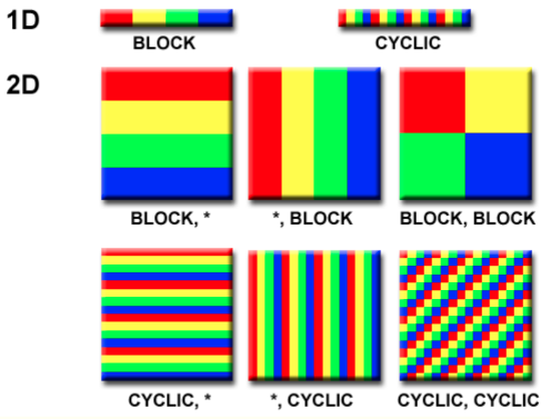 cyclic : 작은 chunk들을 반복적으로 프로세서들에게 할당. load balancing, 지역성에 관점에서는 더 좋은 방법이다