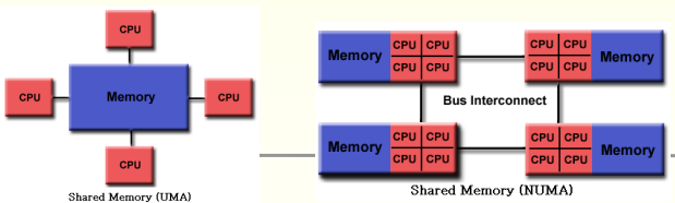 하나의 global address memory를 서로 공유한다. (어떤 cpu든지 메모리의 어느공간이든 접근이 가능)
