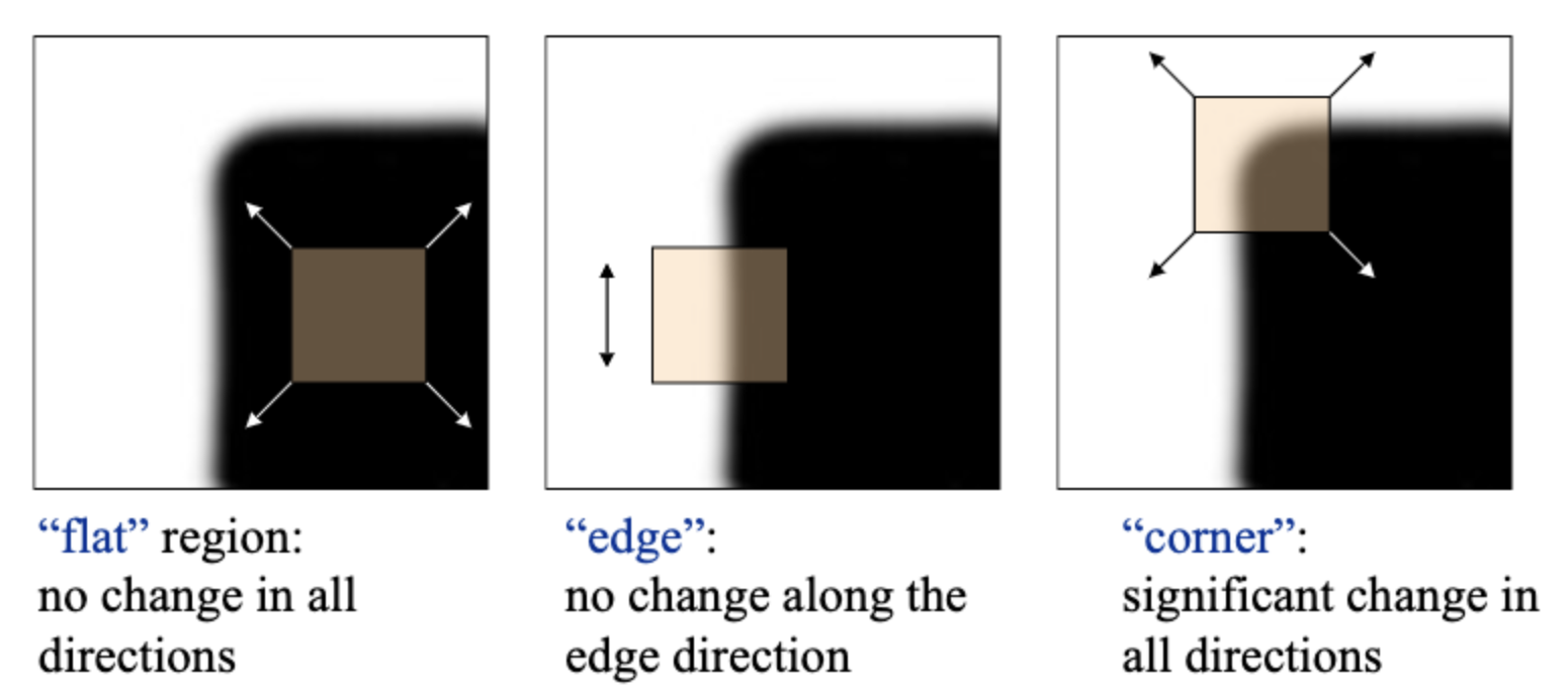 - edge를 탐색했던 알고리즘은 한 방향으로의 intensity 차이에 주목했지만 corner는 any direction에서 intensity차이를 주목한다.