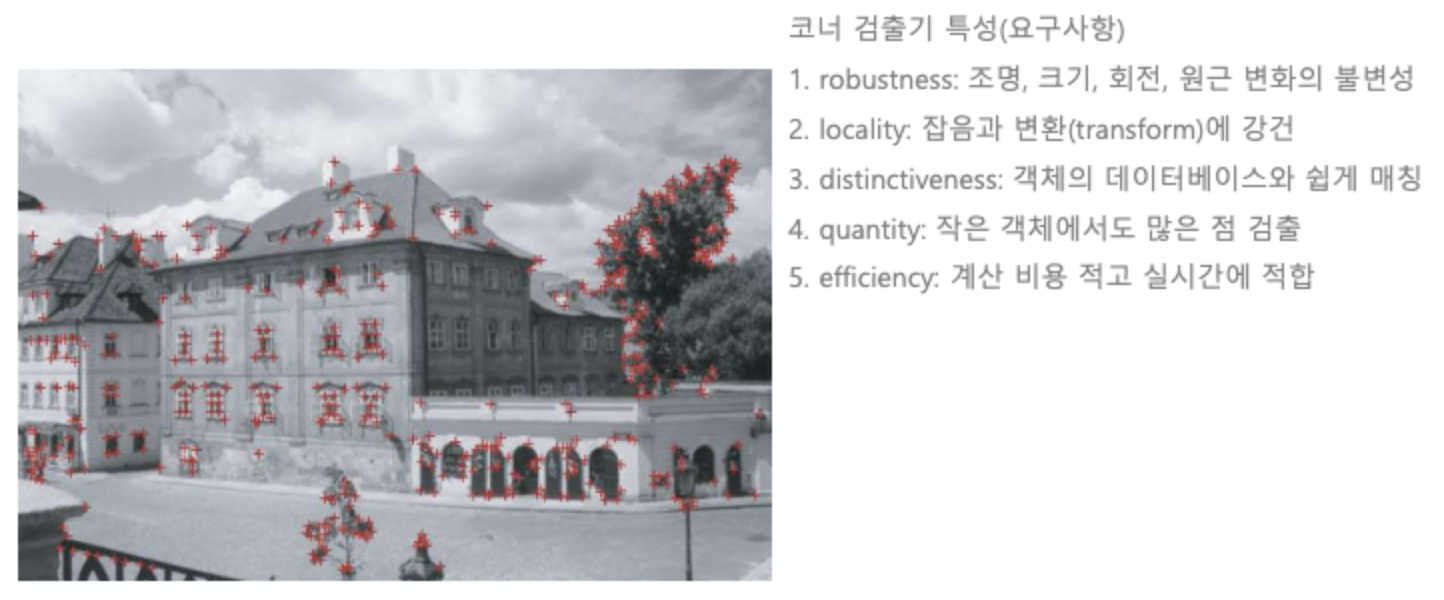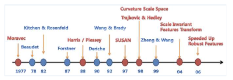 - 위의 5가지 요구조건을 만족시키기 위해서 코너검출기는 시대에 따라 발전해왔다.