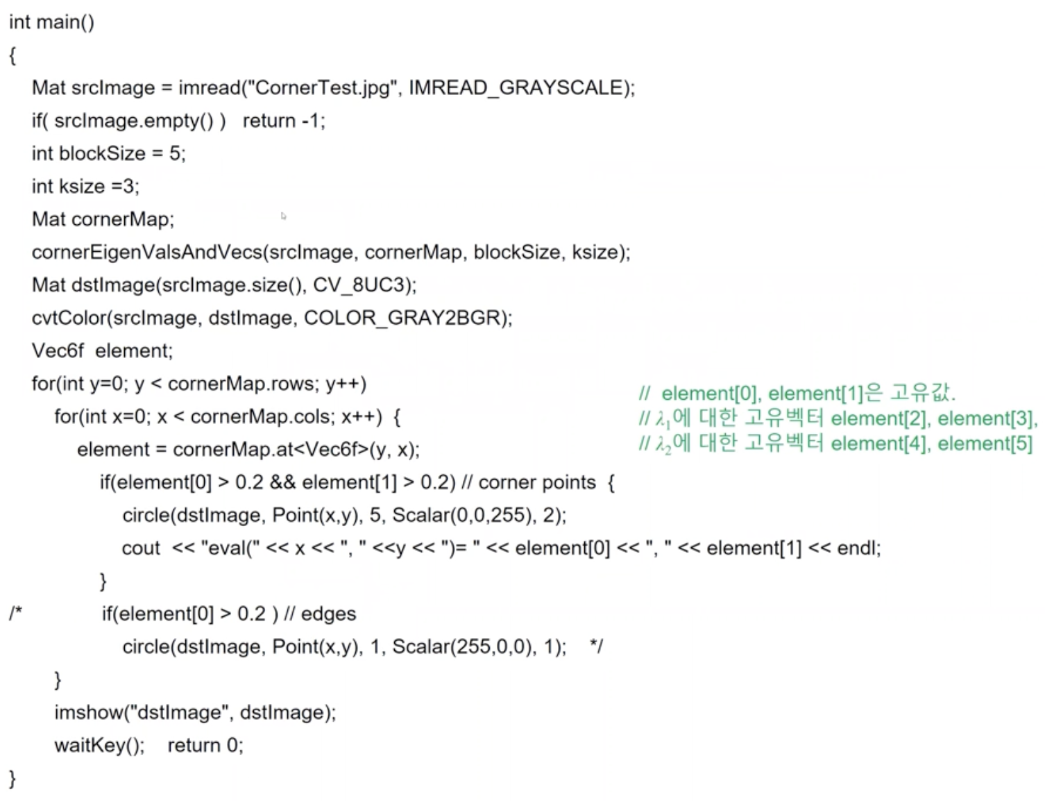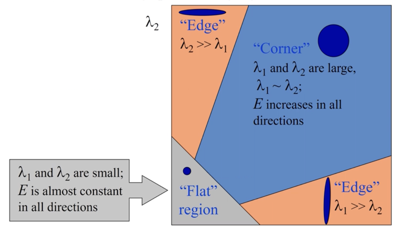 - eigenvalue값이 둘다 작으면 변화량이 거의 없다는 뜻이고 모두 크면 corner 하나만 크면 edge라고 판단할 수 있다.