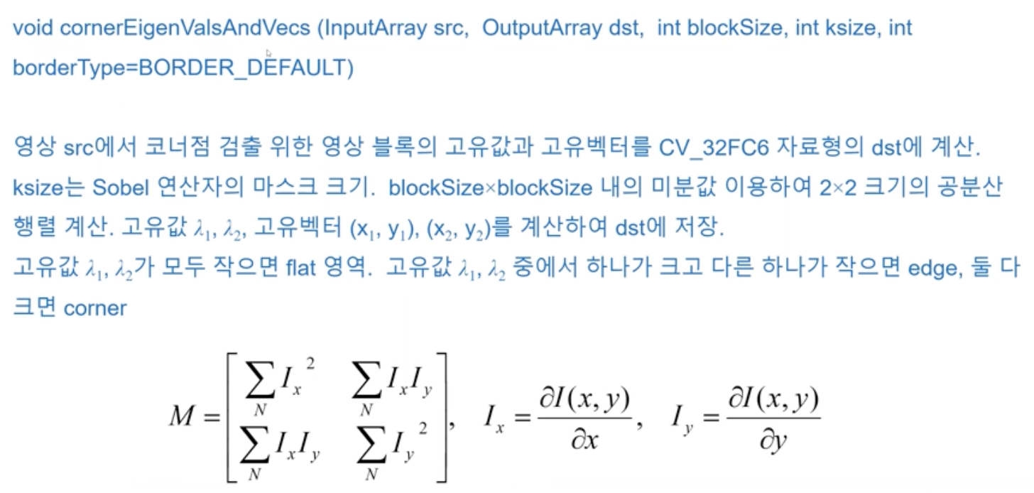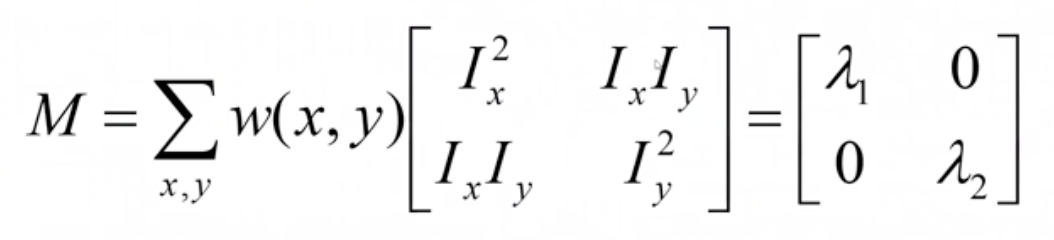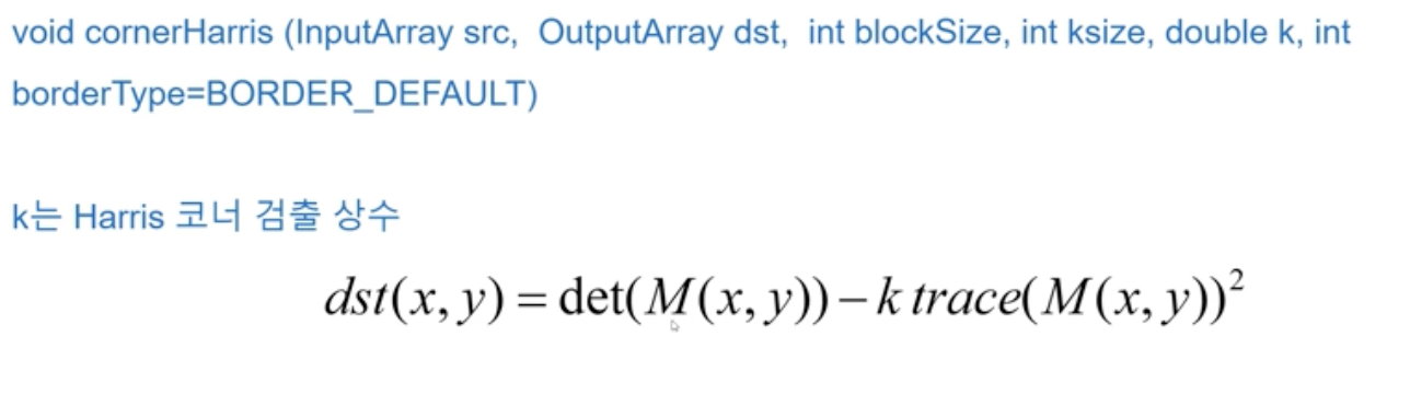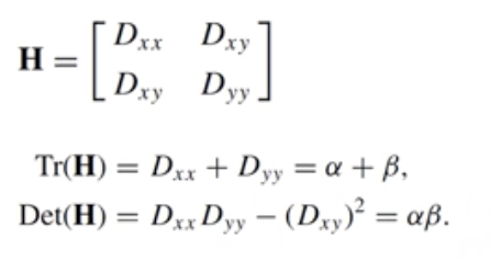 - eigenvalue를 직접구하지 않고 determinant와 trace만으로 corner를 검출하는 harris corner detector이다.
