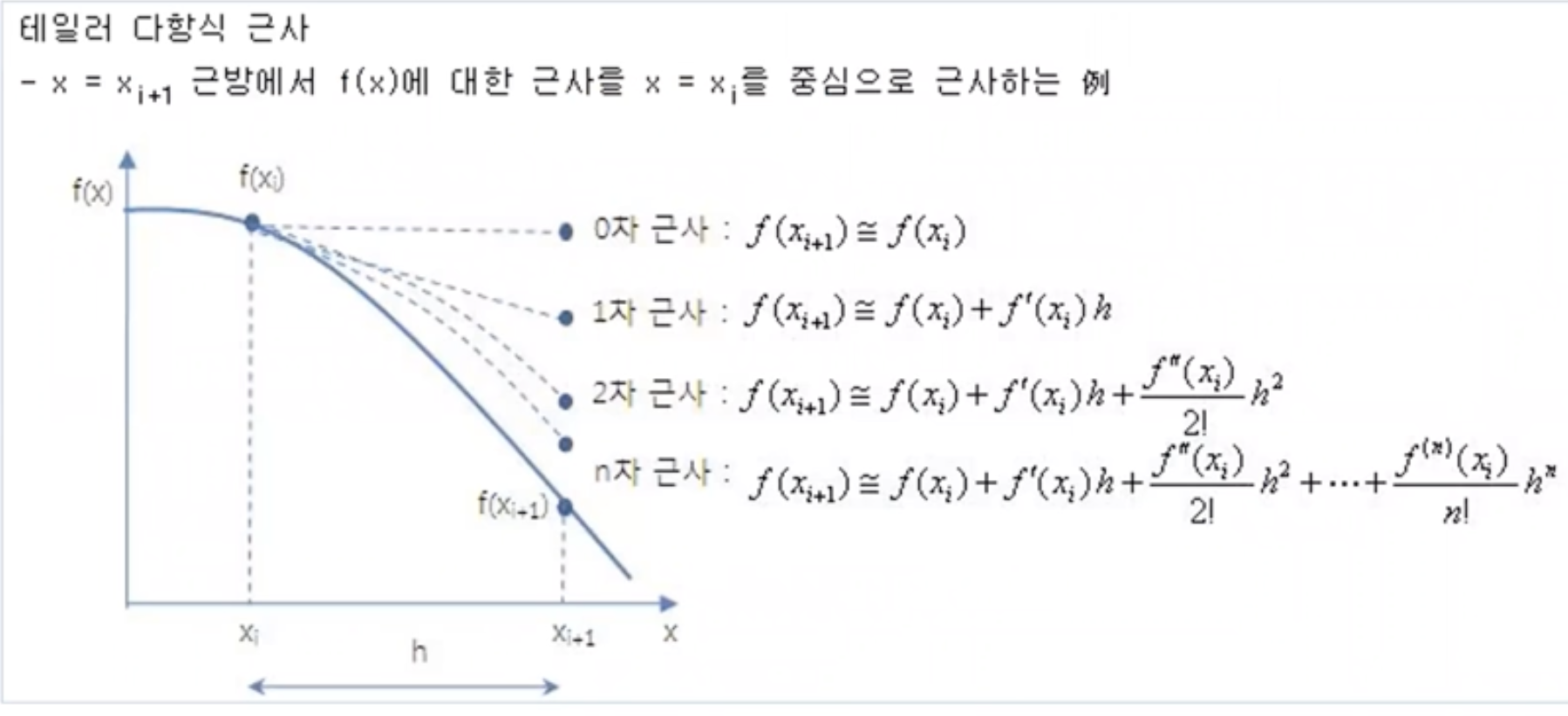 - 어떤 함수 f(x)에 대해서 f(xi)는 알고 있는데 f(xi+1)를 구하기 어려울때, 미분을 통해 함수값을 근사하는 방법이다.