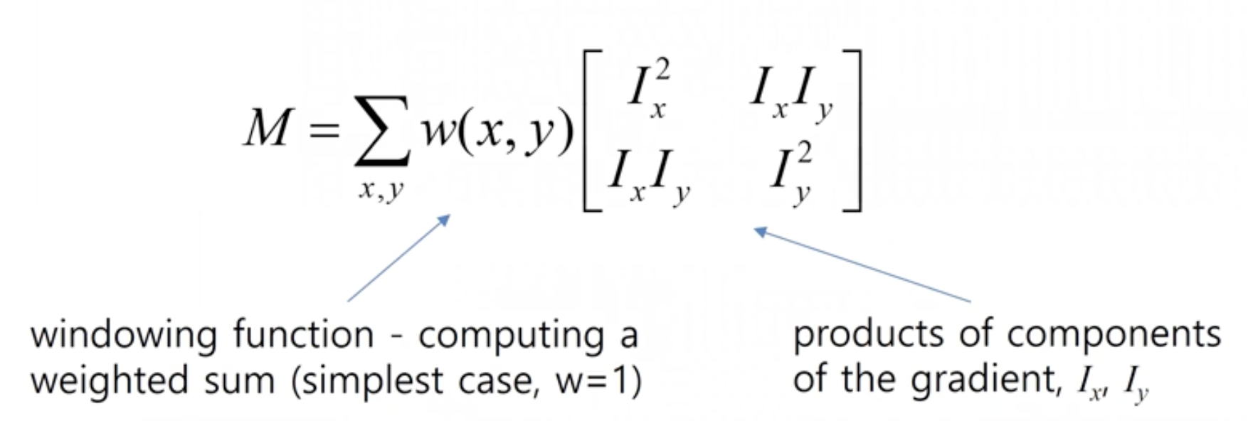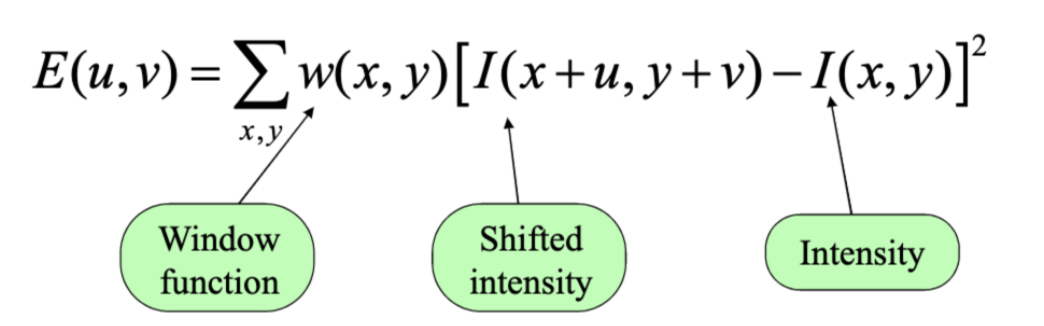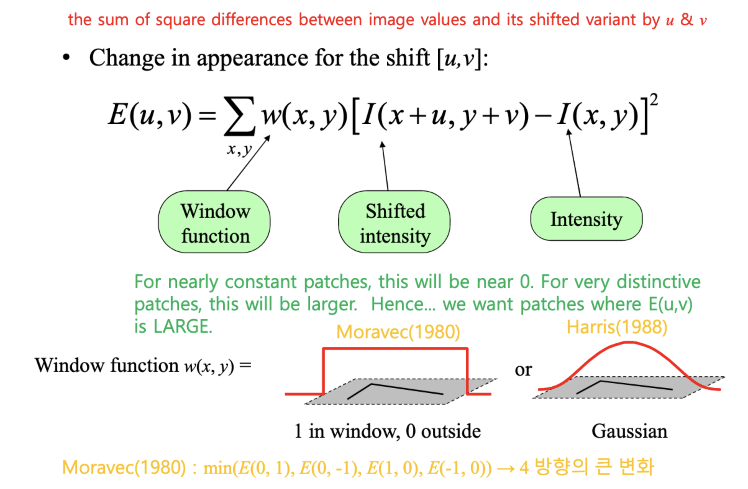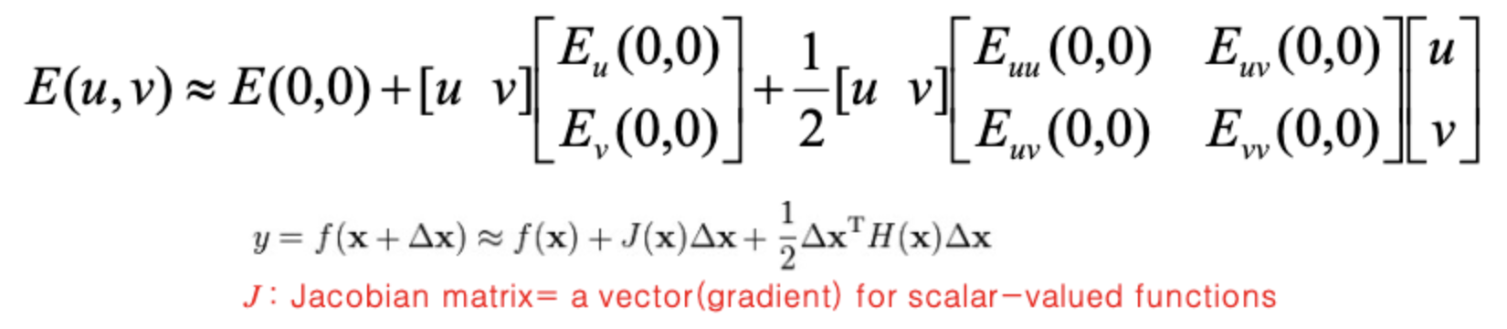 - 정리하면 E(u,v), u,v방향으로 slide했을 때, 픽셀값들의 차이를 approximation하는 것.