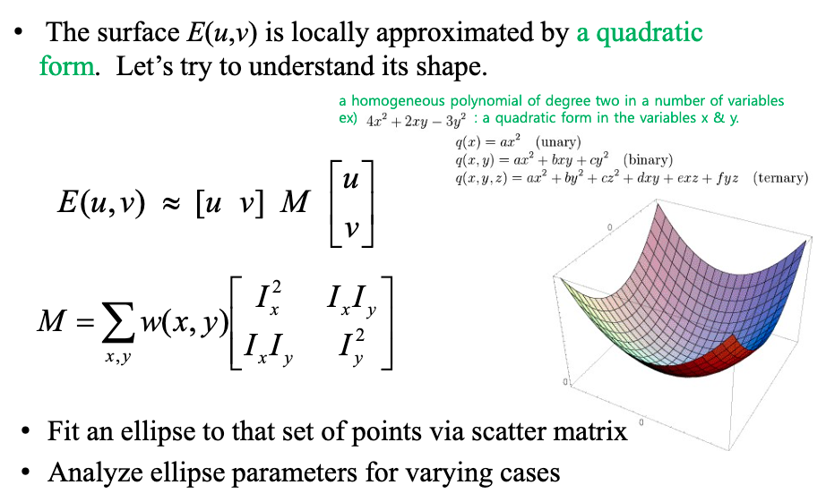 - [u v] M [u v] 이 형태는 quadradtic form을 이룬다고 한다. 그래서 이 M을 second moment matrix라고 한다.