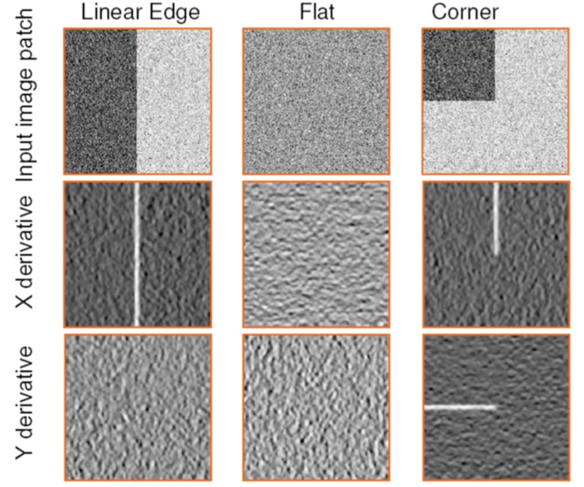 - edge, flat, corner 패치들에 대한 x, y 미분값들을 살펴보면 그 특징이 잘 보인다.