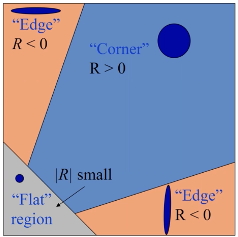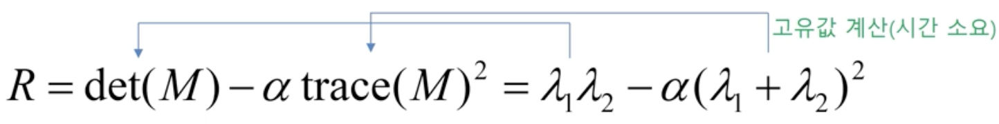 - 고유벡터를 구하는게 오래걸리니 그냥 determiant와 trace만으로 코너를 판별할 R을 구한다.