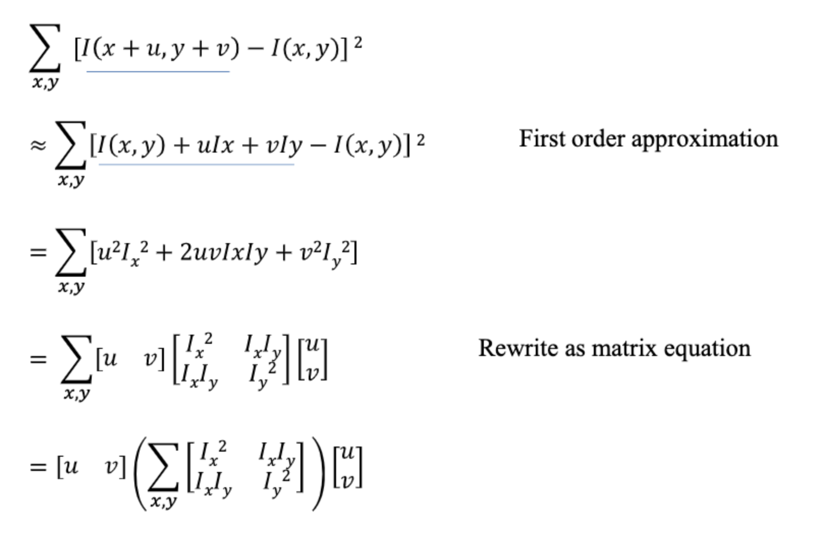 - 결국은 shift를 했을때 차이를 구해야하지만. shift를 실제로 하지는 않고 미분을 활용하여 shift했을때 픽셀값을 예측하면 E(u,v)를 아래처럼 표현할 수 있다.