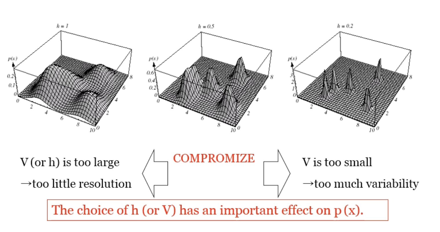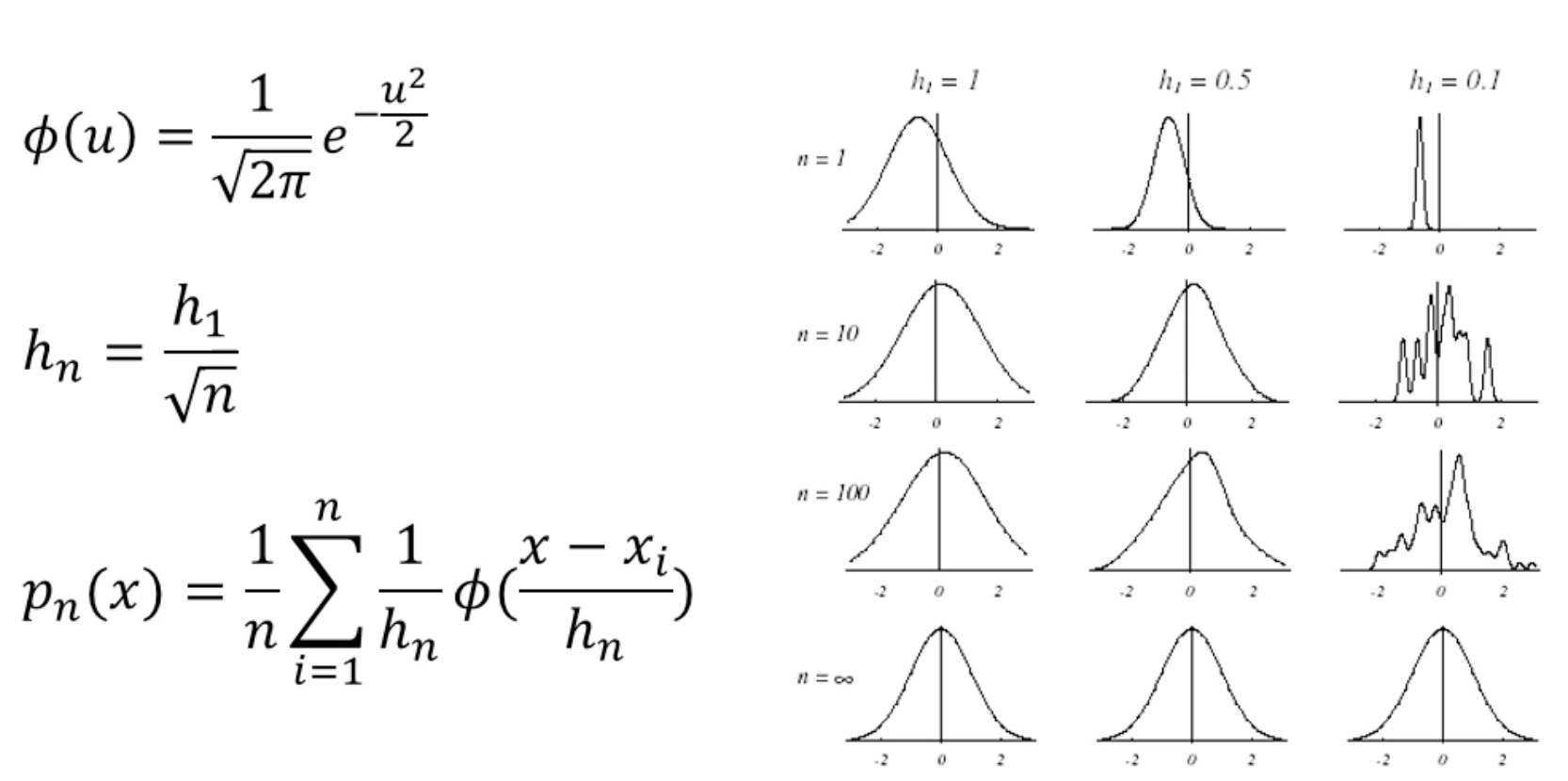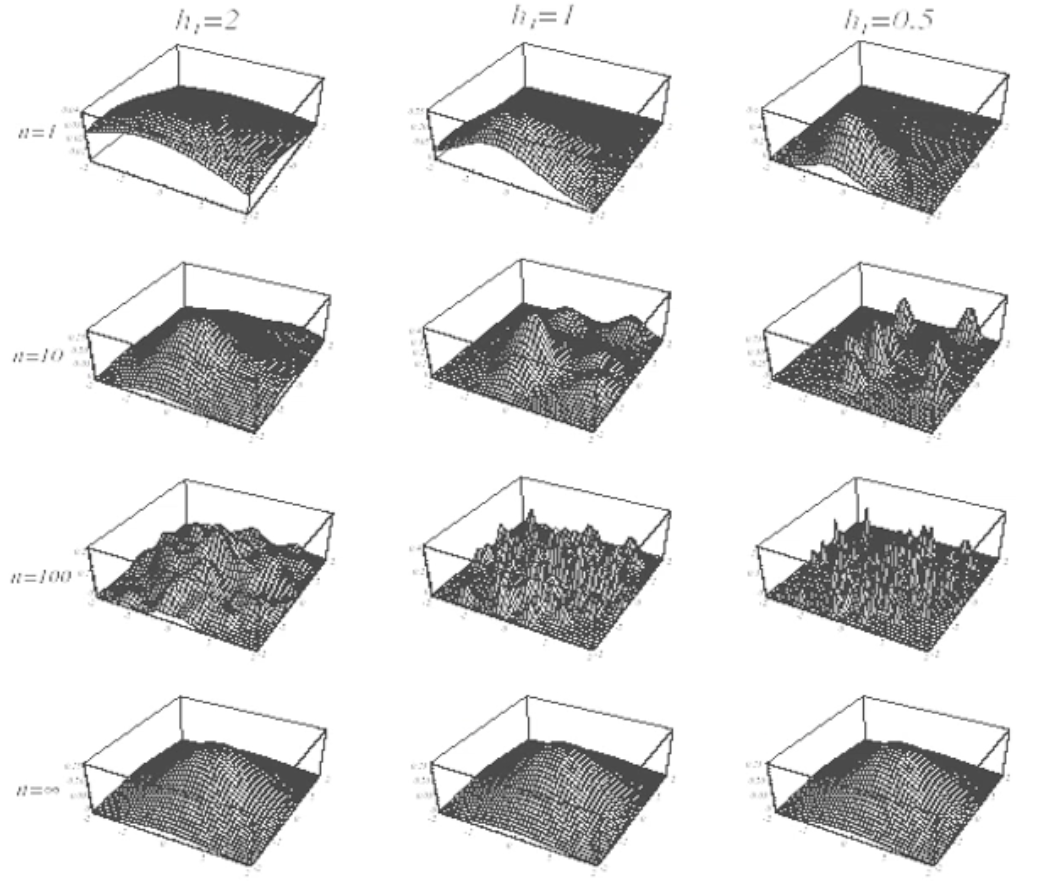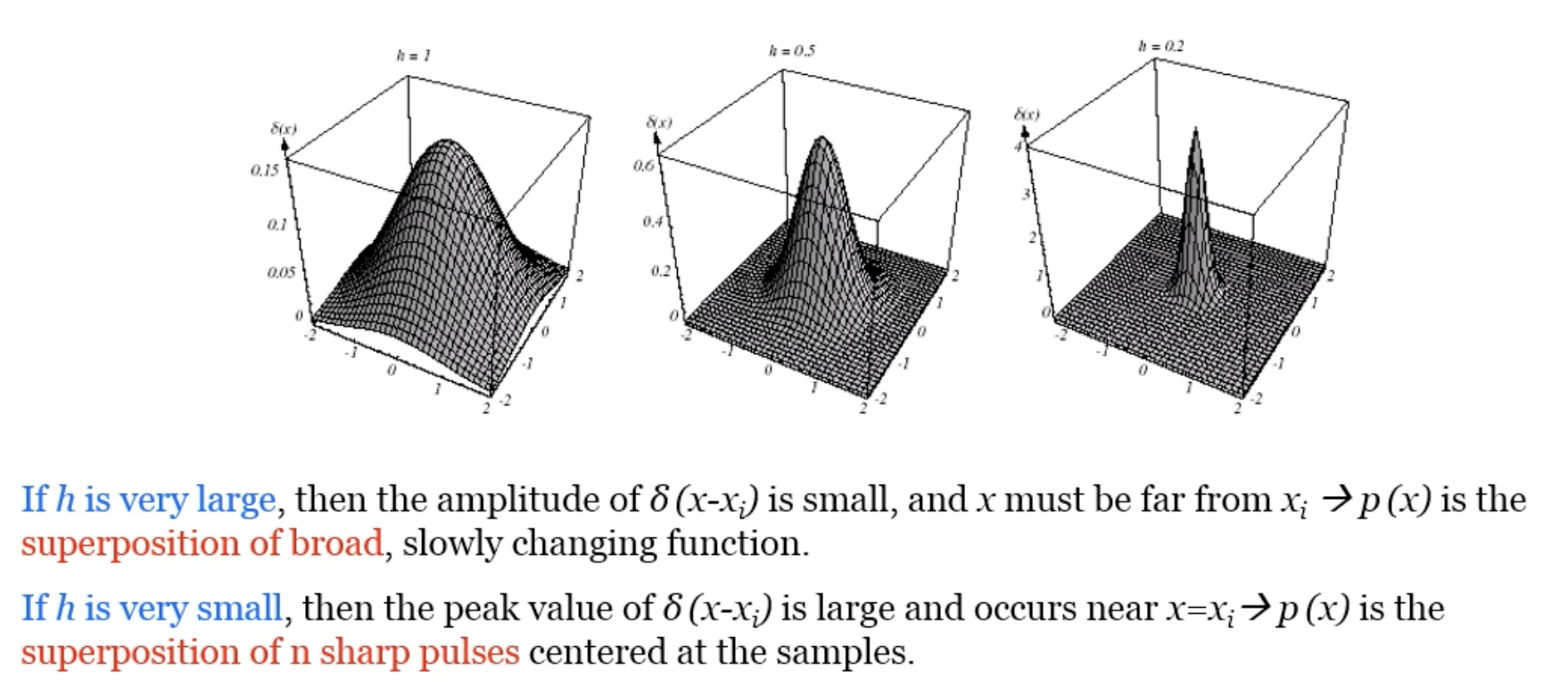 - 샘플의 수가 1, 10, 100, 무한대 일때 P(x)이다. 샘플개수에 따라서 h를 어떻게 잡냐에 따라 확률의 추정이 달라진다.