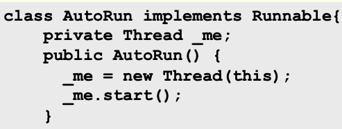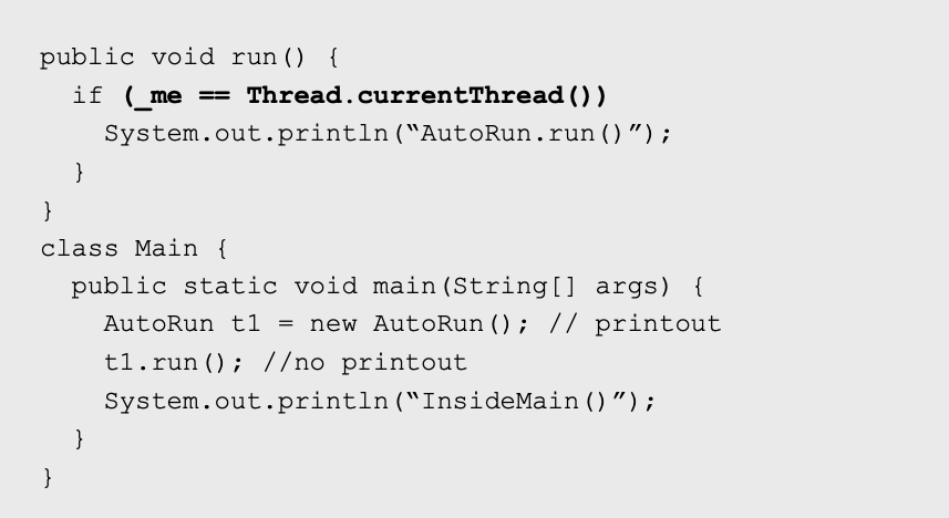 위의 예시에서 main thread가 t1.run을 실행하고 있기 때문에 화면에 문구가 출력되지 않는다. 이렇게 _me가 현재 running thread일 때 "AutoRun.run()"을 출력하도록 한다.