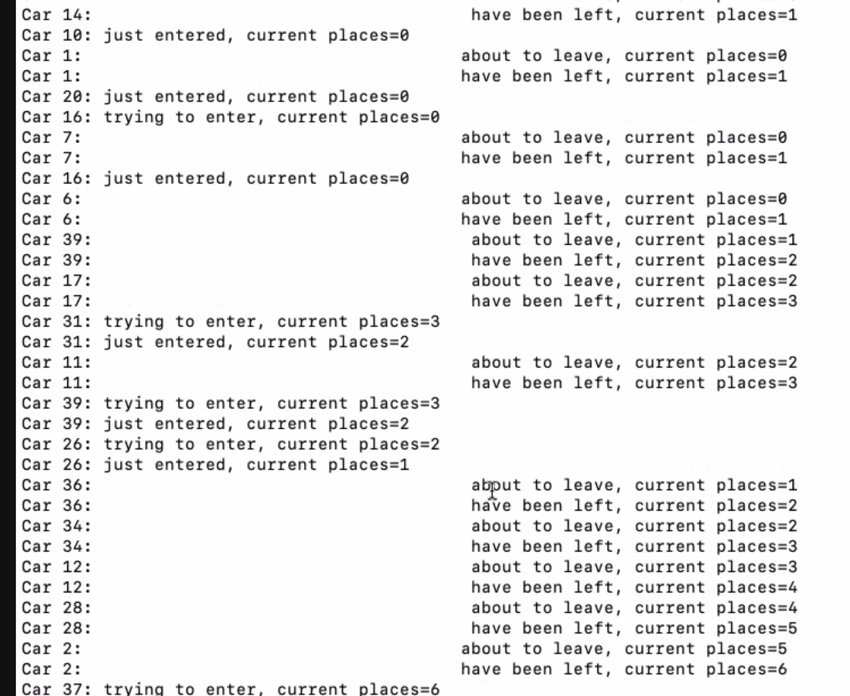 진입로가 한 개인 주차장에 순서대로 여러 차가 진입해서 주차하고 때가 되면 떠나서 다른 차를 위해 자리를 비켜주는 것을 구현한 코드이다.