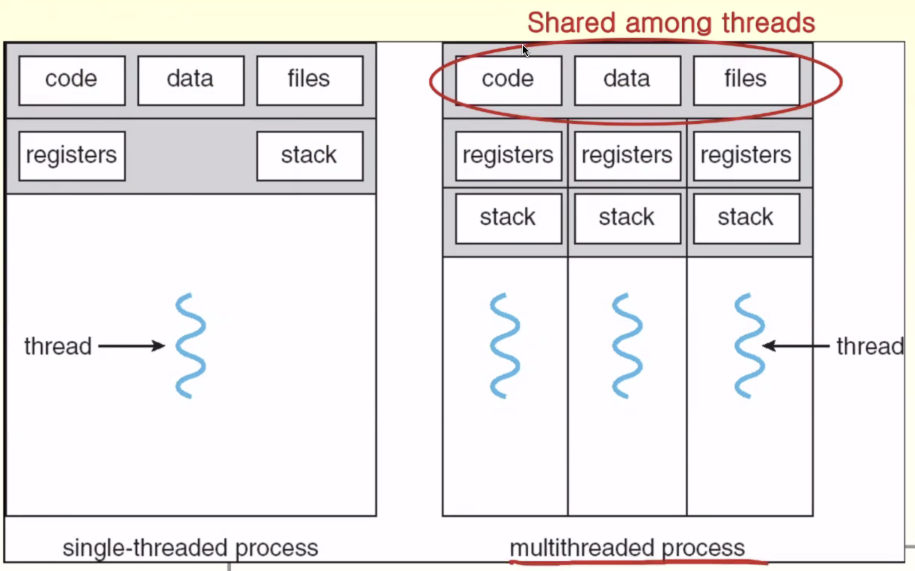 쓰레드들은 code, data, files(process resources)를 서로 공유하고 각자 독립적인 program counter, register, stack을 가지고 있다.