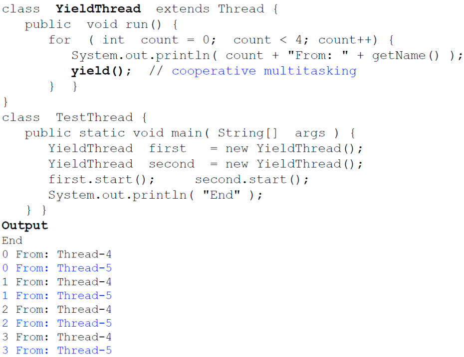 yield() : cpu 점유를 양보한다. 위의 예시에서는 정확히 1번 돌고 cpu를 양보했다.