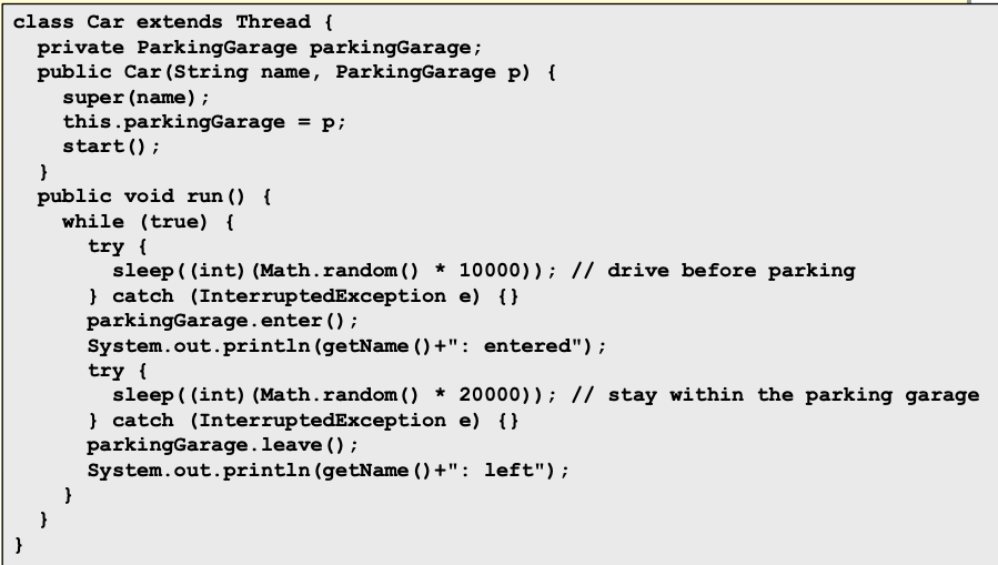 자동차가 진입하려는데 주차장에 공간이 없으면 wait을 만나게 하여 sleep시켜 enter()를 다른 쓰레드에게 양보하고 이 쓰레드를 block상태로 만든다.
