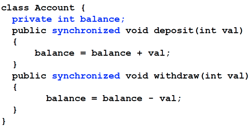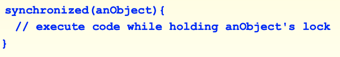 아니면 이렇게 synchronized object를 사용할 수도 있다. ciritical section을 저 괄호 안에 넣기만 하면 mutual exclusion이 보장된다.