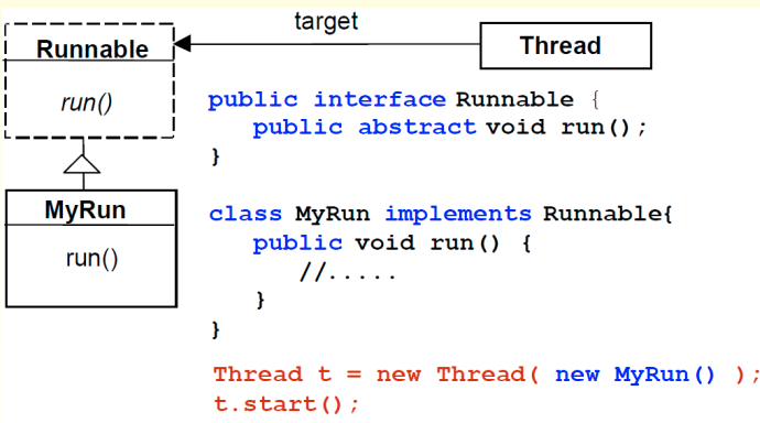 Thread를 상속하는 새로운 클래스를 만드는게 아니라 runnable을 implement하는 MyRun을 만들어서 Thread에 생성자로 전달하는 방법이다.