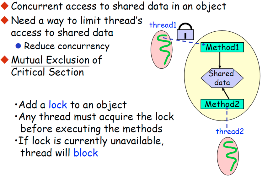 우측 그림에서 shared data에 접근하는 method1, method2가 있다. shared memory에 접근하는 method1,2가 ciritical section이 되고 한 thread가 method1,2를 사용중이라면 다른 thread가 critical section에 진입하지 못하도록 막는 것이 상호배제이다. 그 과정에서 lock을 걸고 unlock을 기다리고 한다.