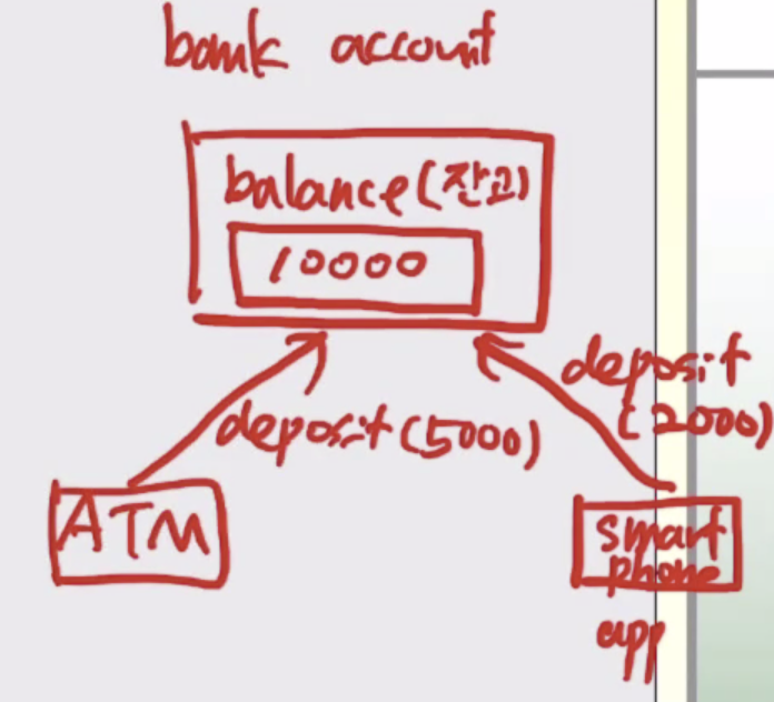 쓰레드 간의 동기화가 정확하게 이루어지지 않았다면 위 상황에서 race condition이 발생할 수 있다. (smart phone, atm이 shared data를 얻기 위해 경쟁한다.)