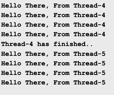 1,2,3쓰레드는 동시에 각자 작업을 수행하는데 오른쪽을 보면 실행 순서가 일관적이지 않다. 각 thread는 서로 다른 실행 속도를 갖기 때문이다. 작업량 차이, 스케쥴링 문제, 코어의 성능 등 원인은 다양하다.
