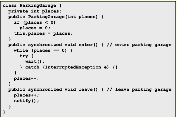 자동차가 진입하려는데 주차장에 공간이 없으면 wait을 만나게 하여 sleep시켜 enter()를 다른 쓰레드에게 양보하고 이 쓰레드를 block상태로 만든다.