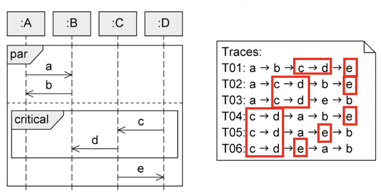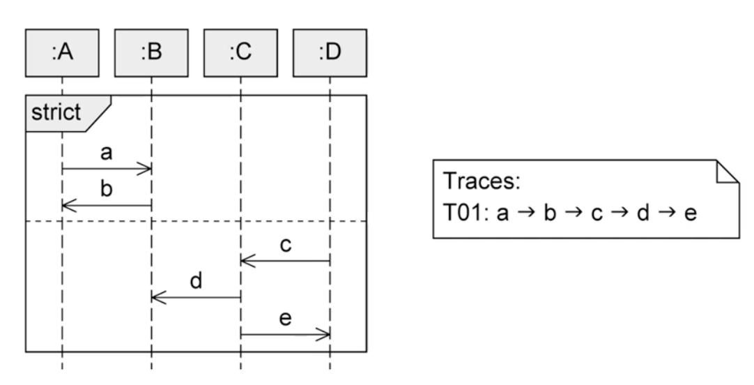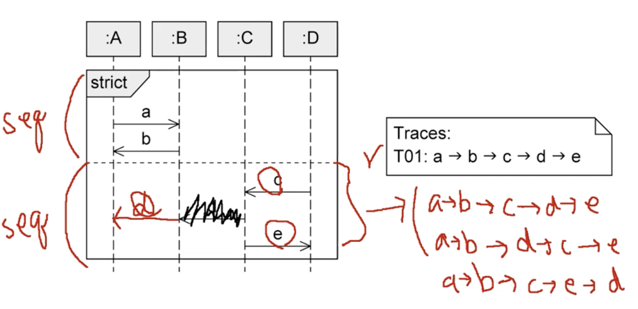 - strict fragment에서 점선으로 나뉜 두 operand는 어쨌든 각각 seq fragment들이고 각 seq fragment안에서의 가능한 Trace는 얼마든지 있을 수 있다.