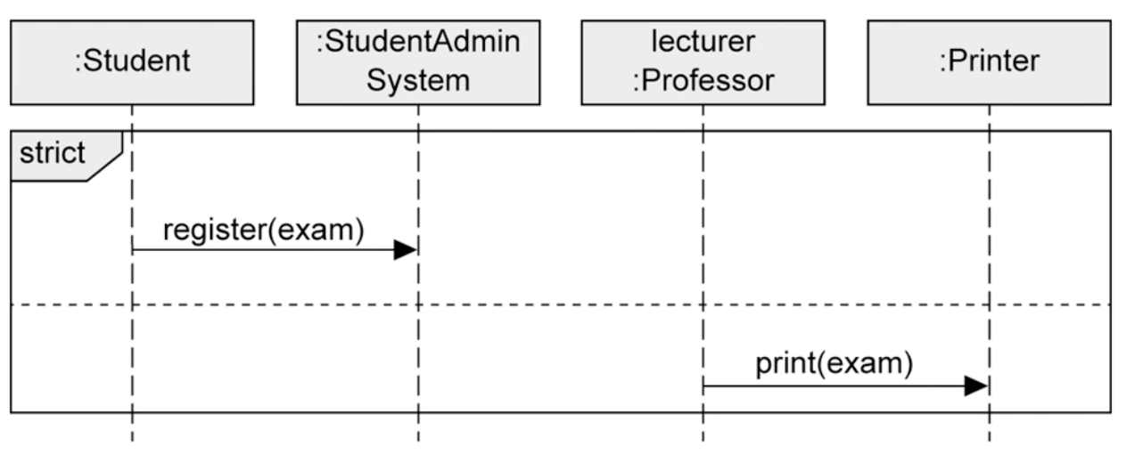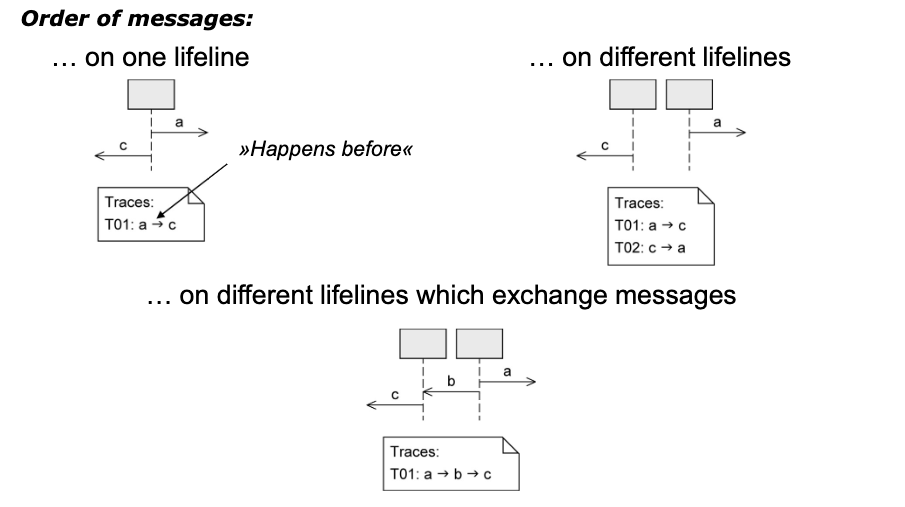 - weak sequencing : 위 그림처럼 서로 다른 lifeline에서의 메시지들의 순서는 자유롭다. 단 하나의 lifeline에서의 메시지들의 경우 순서는 시간축을 따른다. T01, T02, T03 모두 가능한 경우이다.