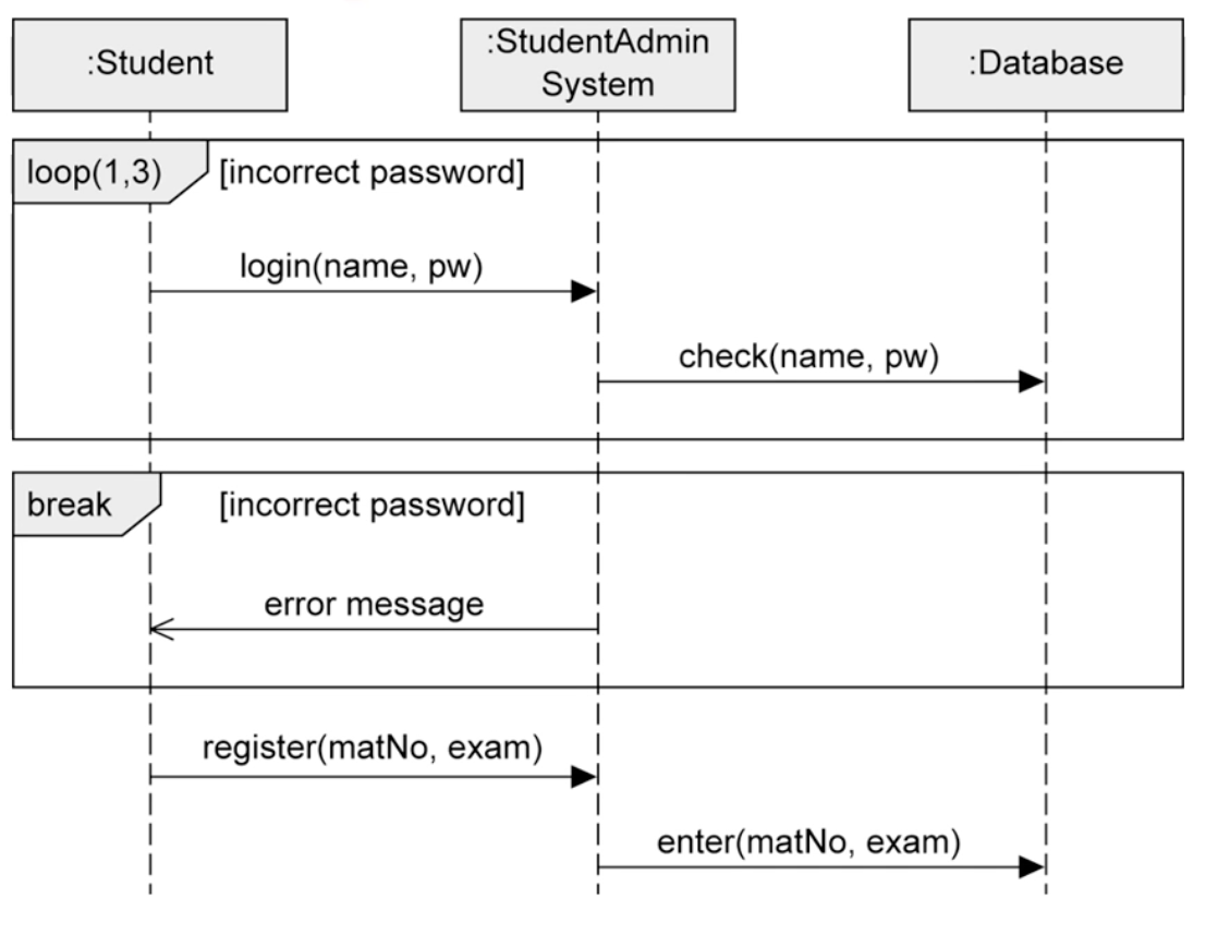 - 3번의 루프가 끝나고 여전히 incorrect password상태인 경우 break fragment로 들어간다. break의 부모 clause는 sequence diagram 전체이기 때문에 register 메시지를 보내는 단계를 건너 뛴다.