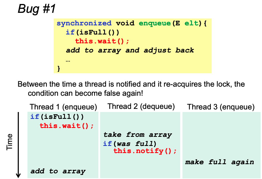 * if문을 사용하면 위같은 문제가 있다. thread1이 기다렸다가 thread2의 깨움을 받고 버퍼에 데이터를 추가하려고 하는데 그 사이에 thread3이 버퍼를 써버렸을 수도 있다. 즉 if->wait을 통과한 시점에 다른 쓰레드가 진입할 수도 있으니 항상 while문으로 조건을 재확인하도록 하자.