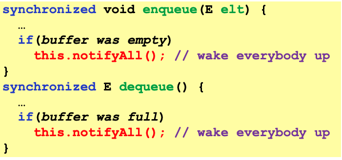 while()문 이후에 enqueue에서는 버퍼가 비었을 때, notifyAll() 로 잠자고 있는 모든 쓰레드를 깨운다. (그 중 잠자고 있던 모든 생산자들을 깨우기 위해)