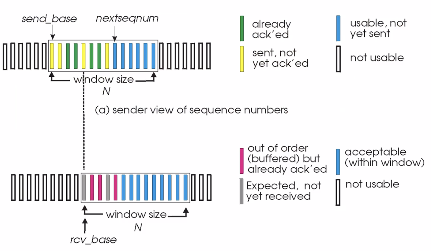 초록색은 이미 수신 완료가 보장된 패킷들이다. 노란색은 보내긴 했는데 수신완료가 아직 되지 않은 패킷들이다. 파란색은 아직 보내지 않은 패킷들이다.