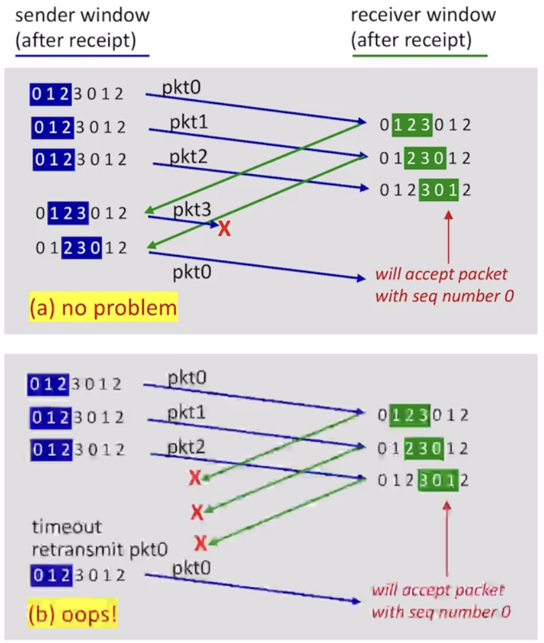 (a), (b) 상황은 전혀 다른데 receiver는 동일한 상황으로 인식한다. 즉 (b)에서 옛날 0번인데 receiver는 다음 0번을 받았다고 생각한다. 그래서 2^k에서 k는 2N보다도 꽤 크게 잡는다.
