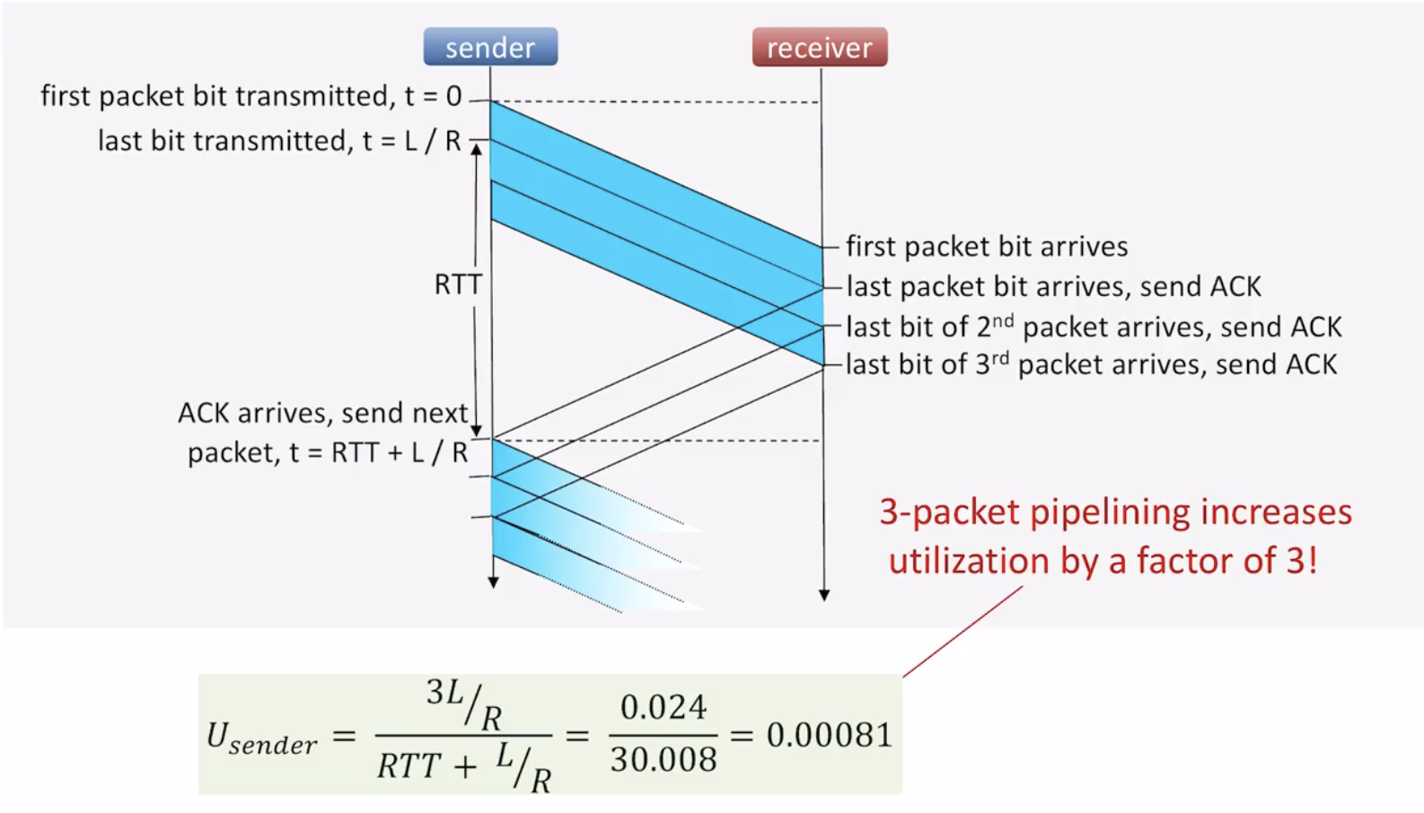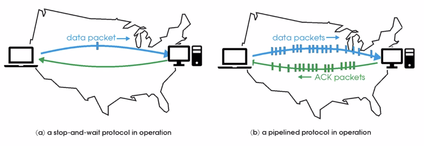 (link utilization을 높이기 위해) pipelining은 ack를 받기 전에 한 번에 여러개의 패킷을 연달아 보내는 것이다. 이를 구현하기 위해서는 sequence number의 범위가 커져야 한다.