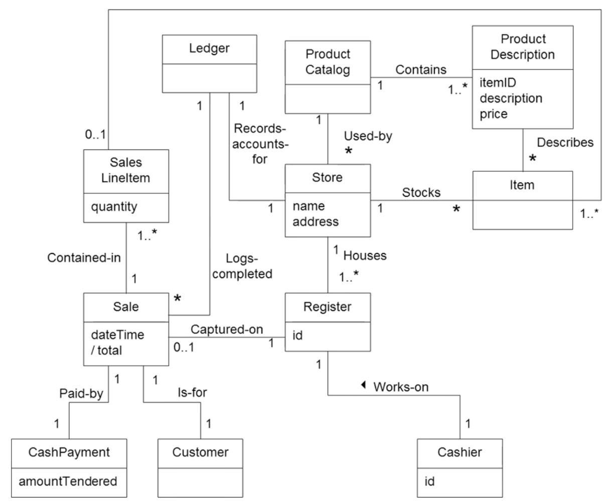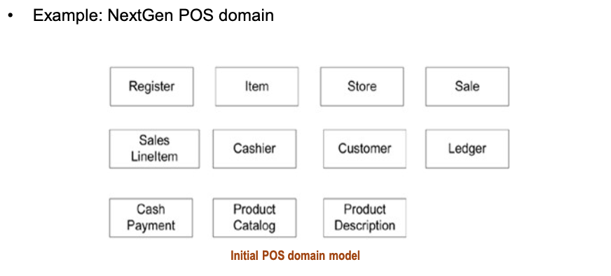 - 예를들어 마트의 POS 시스템을 설계한다고 해보자. 이렇게 시스템에서 필요한 class들을 시각적으로 표현한 모델이 바로 domain model이다.