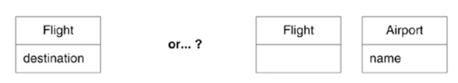 - 혹은 독립된 class로 나타내지 않고 다른 class의 속성으로 나타내야 하는가?의 고민도 빈번할 수 있다. 위의 경우는 목적지를 airport라는 독립된 class로 분리하고 관계를 맺는 것이 타당해 보인다.