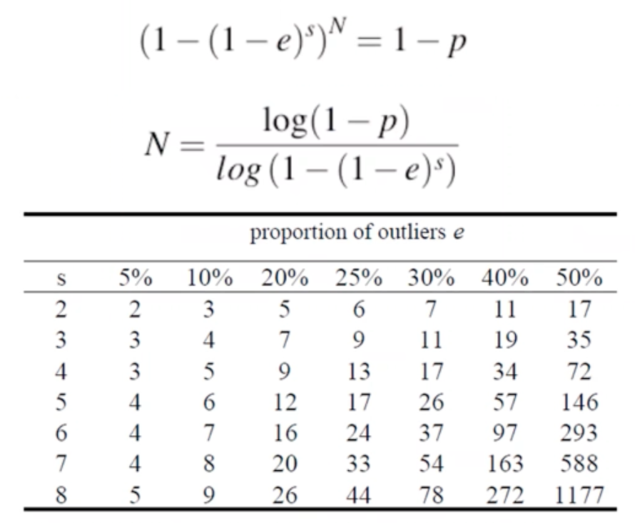 - 확률적으로 s=2(직선) 모델을 찾는 경우 전체 데이터에 대한 outlier의 비율이 5퍼센트라면 2번만 무작위 선택 후 비교를 해보면 된다.