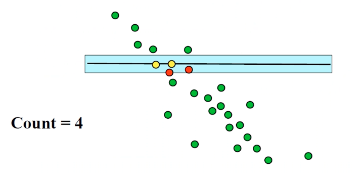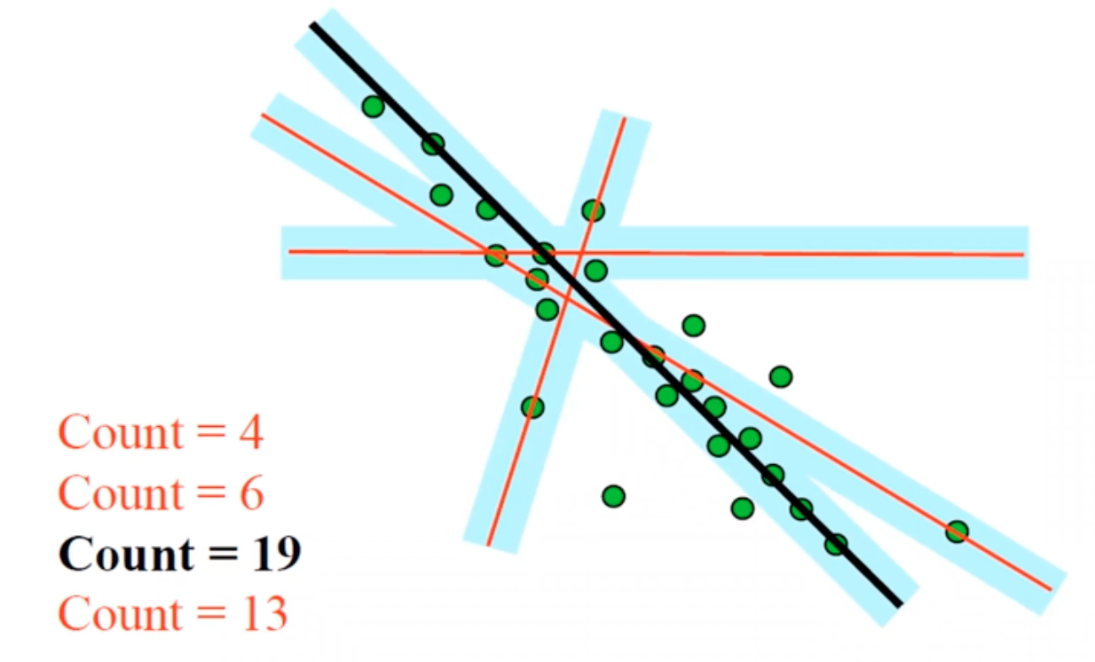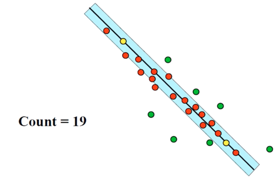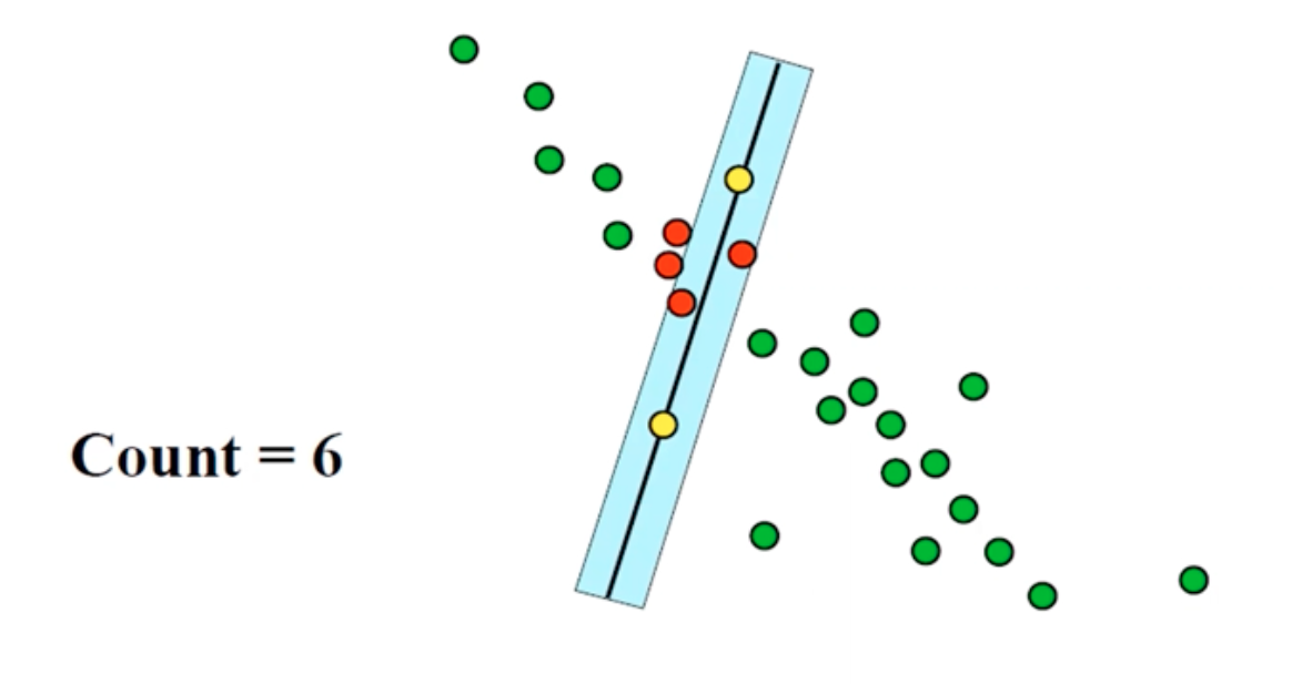 - 무작위로 두개의 점을 잇는 직선(model)을 그리고 그 직선에 데이터가 얼마나 많이 해당되는지 투표하는 방식이다. (inlier 수)