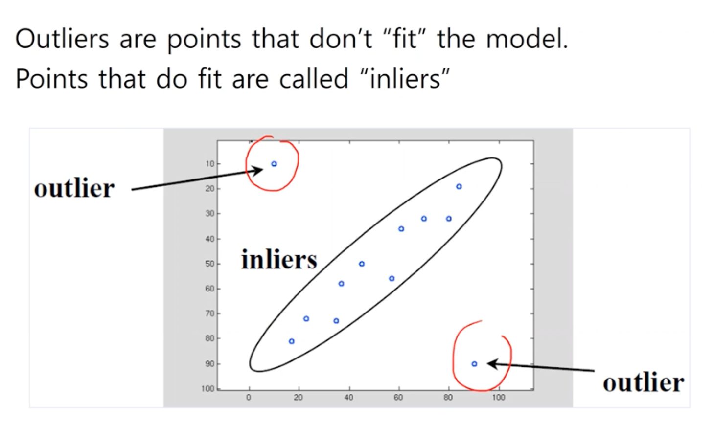 - RANSAC은 컨센서스가 최대인, 즉 가장 많은 수의 데이터들로부터 지지를 받는 모델을 선택하는 방법이다.