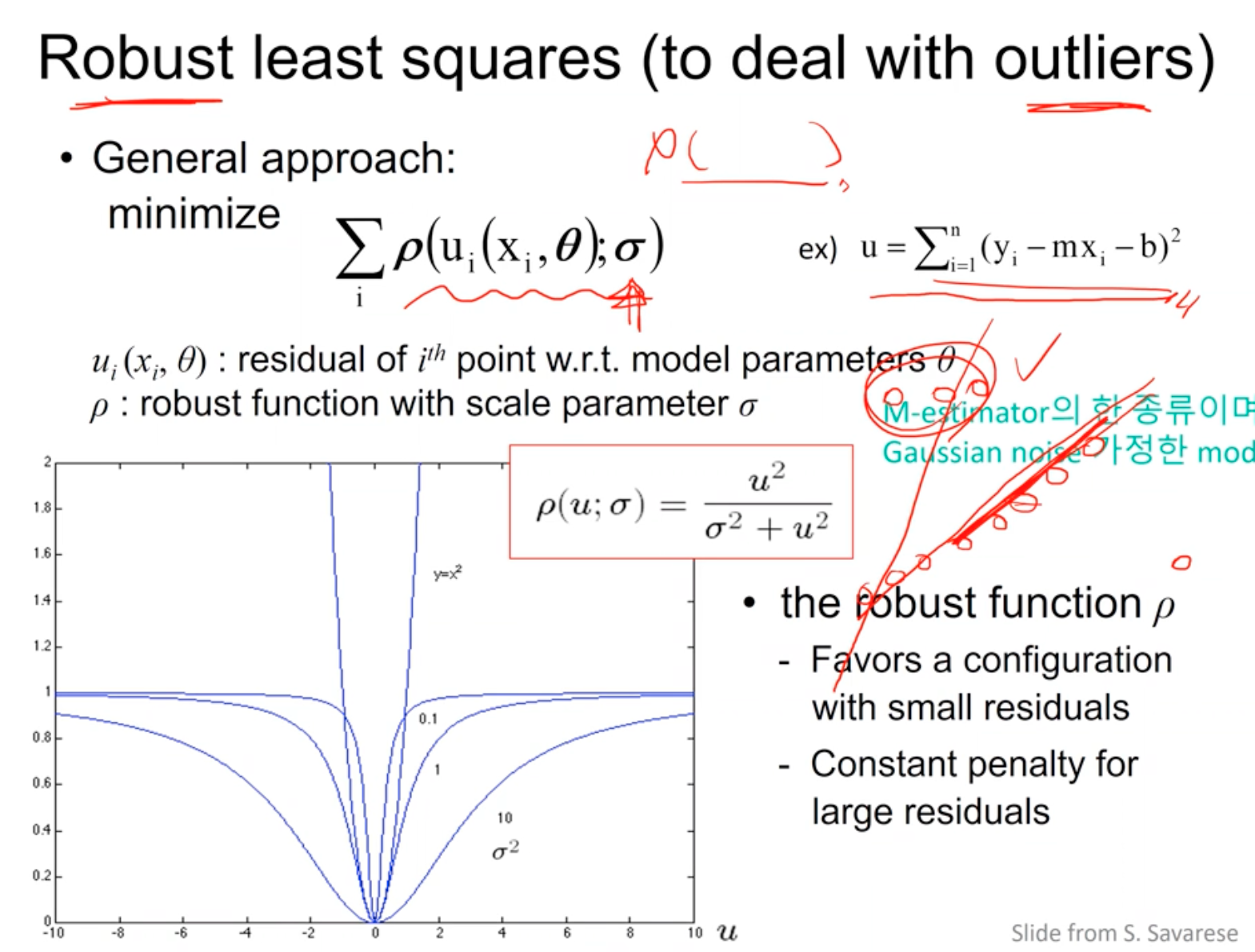 - 얘는 outlier가 있어도 robust한 fitting을 하도록 로우 function을 정의한다.