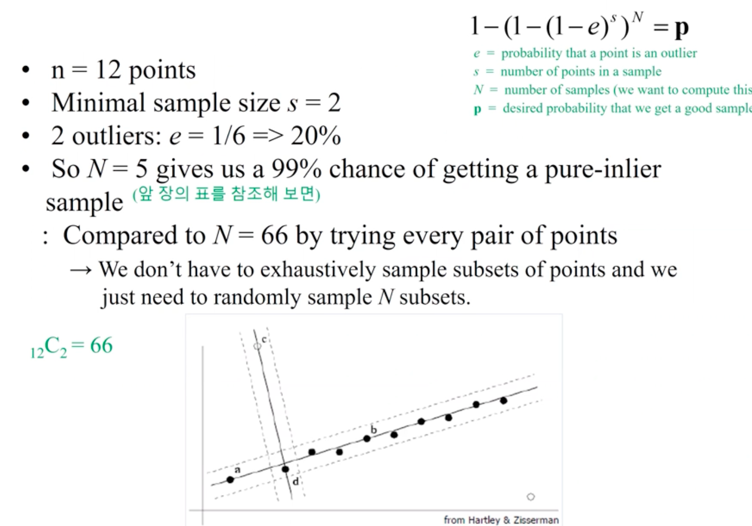- 총 12개의 점중에 outlier는 2개이다. 그럼 Outlier의 비율은 20퍼센트보다 크다. 그러면 총 5번 투표를 반복하면 그 결과가 inlier를 잘 포함할 확률이 99퍼센트가 된다.