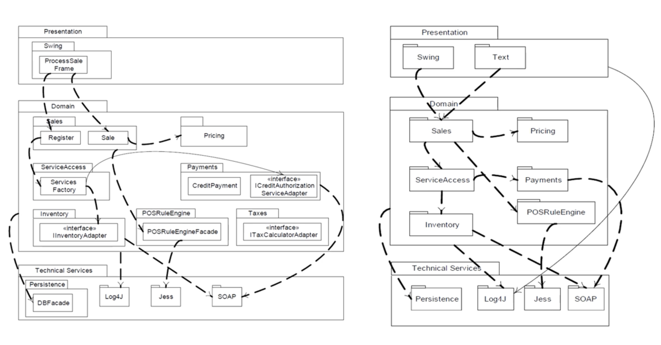 - relaxed layered architecture : 상위 레이어는 하위 레이어들의 서비스를 호출 가능 (UI 레이어에 있는 web 패키지는 인접하지 않은 하위 레이어의 Logging 패키지를 사용할 수 있다.)