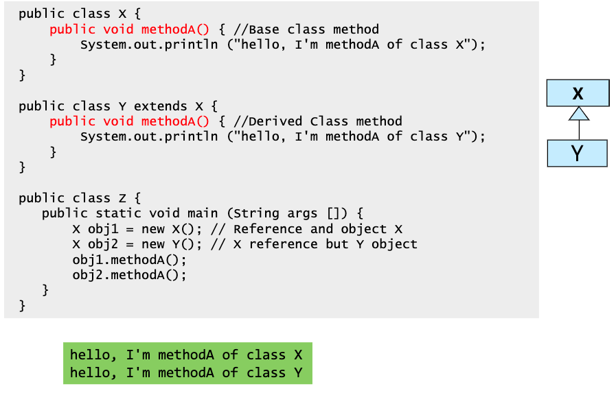 - X, Y 모두 methodA()를 가지고 있기 때문에 Y를 가리키고 있는 X는 methodA()를 호출하면 Y의 것을 호출한다.