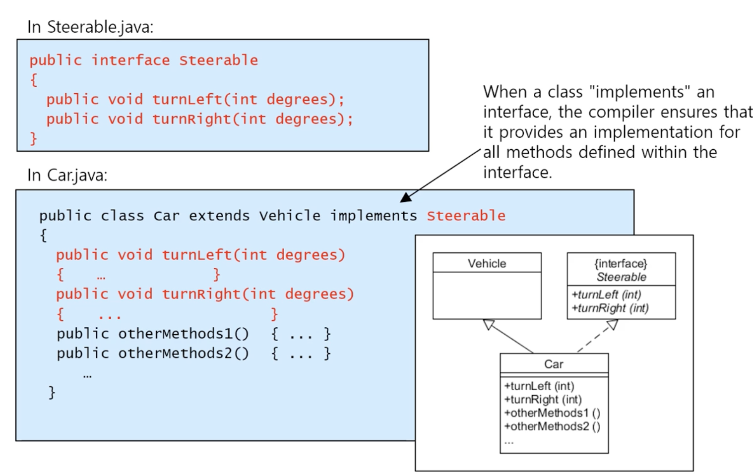 - 인터페이스를 Implement하면 반드시 추상 메서드들을 구현해야 한다.