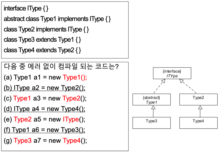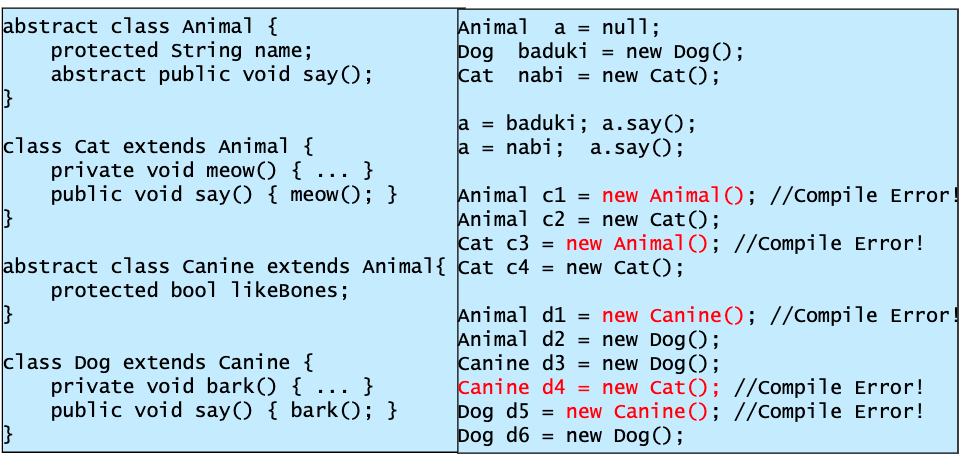 - 여기서 a는 Animal을 가리킬 수 있는 reference이다. Animal instance는 만들 수 없지만 a가 자식 클래스의 인스턴스들을 가리키는데는 전혀 문제가 없다. (다형성)