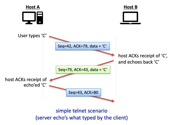 A -> B : 'c' 데이터 패킷(seq42)를 전송. ack번호는 79번 사용할 것임을 알림.
