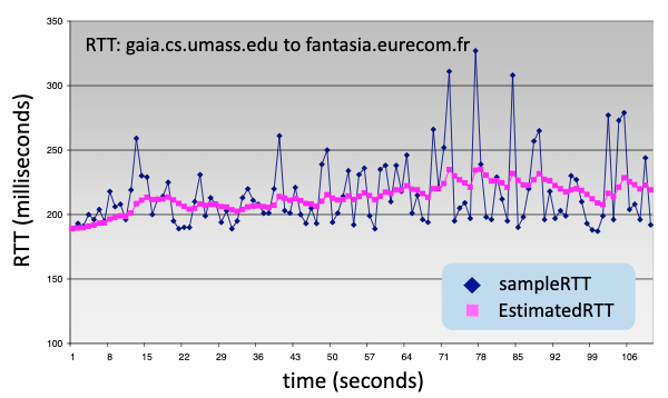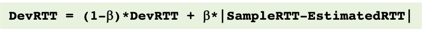 이런식으로 예상 RTT를 계산하게 된다. 뒤로가면 갈수록 이전 EstimatedRTT의 영향은 빠르게(지수배로) 줄어든다.