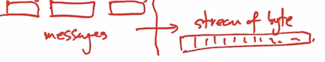 reliable in-order byte stream : tcp는 신뢰성 있는 전송을 지원한다. (100퍼센트 or 0퍼센트) segments들은 tcp에서 byte stream로 구분 없이 전달된다.