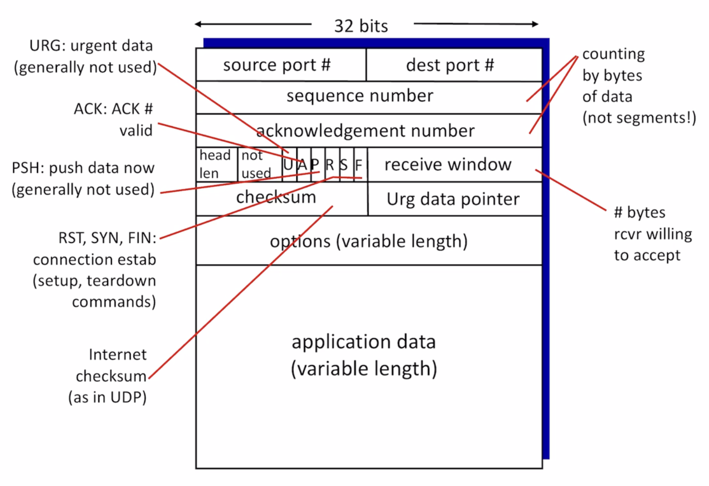 receive window : receiver가 받으려고 하는 bytes를 나타낸다. flow control을 위해 사용된다. (수신자의 버퍼크기를 초과해 보내지 않도록)